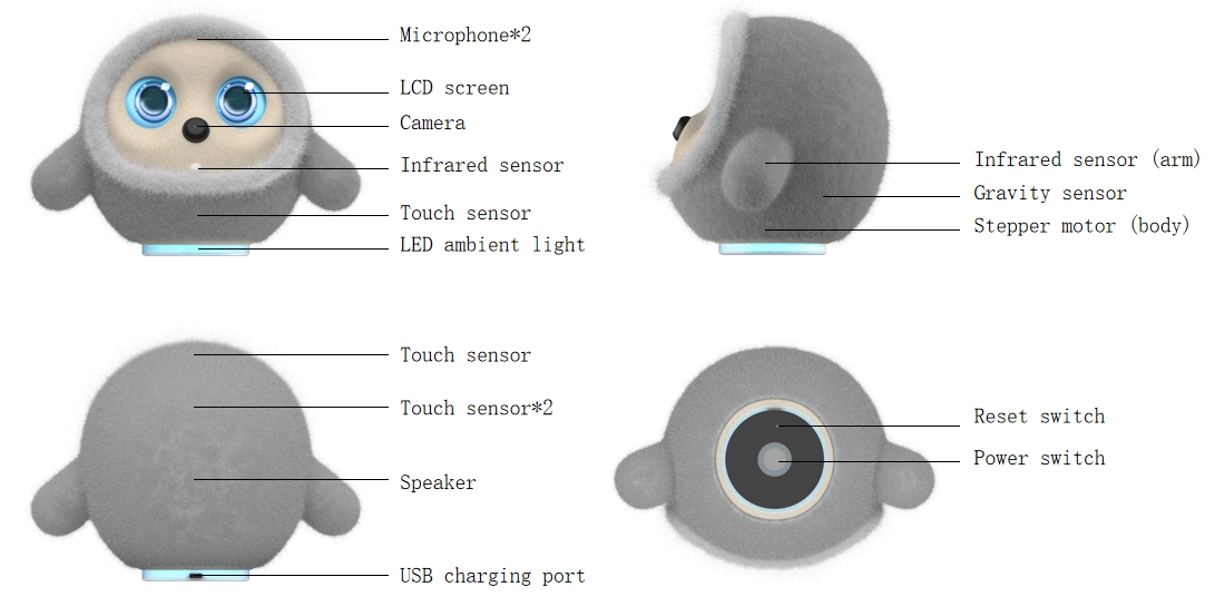 | 液晶表現画面 | 4.28インチのLCD画面(目)、ダイナミックな表現表示と両眼表示(例えば、 「死んだふりをする」または「かわいいふりをする」ときの視覚的なフィードバック)。 |